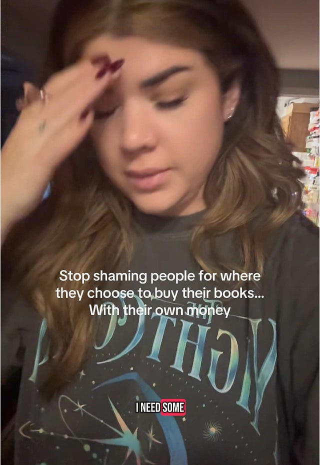 First off, why is it any of your business where people are getting their books? Why do YOU care if they are buying books from places that are available to them or within their budget? Not everyone has a local indie bookstore that they can support. Of course, if you can, support local bookstores, shop ethically and sustainably, but not everyone can.